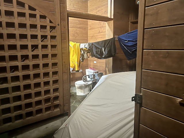 I edited this report seated atop the handicap toilet. I've completely made myself at home and my possessions are scattered everywhere. The rain eventually began to subside, which unleashed the mosquitoes.