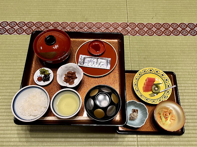 I slept well on my futon atop the tatami mats at the at the Ren'gejo-in Temple pilgrim's lodging in Koyasan. The sunrise was at 4:42am and soon thereafter started streaming through my window. Morning chanting in the temple began at 6am sharp. We were all invited to sprinkle special crystals into the burning insense. Afterwards I had breakfast.